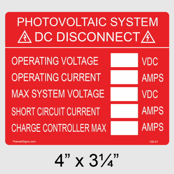 Solar PV disconnect write-in label with red background and white letters (4″ x 3″). Made in the USA with UV-resistant, NEC-compliant, outdoor rated Avery Dennison® MPI Hi Tack Easy Apply™ vinyl. The sign reads: ‘PHOTOVOLTAIC SYSTEM DC DISCONNECT OPERATING VOLTAGE VDC OPERATING CURRENT AMPS MAX SYSTEM VOLTAGE VDC SHORT CIRCUIT CURRENT AMPSCHARGE CONTROLLER MAX AMPS’. This label is available as a red label and red placard. This label is used on dc strings solar installations